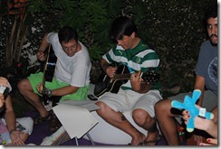 Eu, Fofo, Jô e Gui selecionamos algumas canções para serem tocadas durante a festa. A idéia era com descnotração unir adultos e crianças embalados por músicas como A casa, o Pato, Cocoricó, Ilariê, Caranguejo não é peixe, Yellow Submarine, Biquini de bolinha amarelinha,dentro outros. A Jô imprimiu tudo, ensaiamos algumas vezes, descobrimos o talento do Miguel para tocar violão com os dentinhos, a la Jimi Hendrix rs) e ficou claro que ele AMA música e violão. O ensaio na madrugada anterior, durante a arrumação foi hilário, com a participação do Kauan, que dançou, cantou e tocou pandeirola em todas as músicas, foi nosso test drive. Distribuimos chocalhos de verdade e outros chocalhos que são brinquedinhos de criança para quem quisesse acompanhar. Adultos e crianças. Foi muito gostoso ver a interação. Agradecemos de coração tios Jô e Gui pelo carinho.
